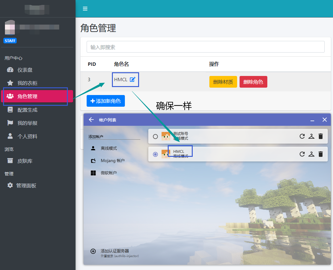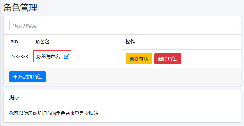 Blessing Skin 服务器, 进入 **角色管理 , 查看角色名 , 确认 角色名 和 HMCL中创建的离线账号角色名 相同, 如果不相等, 请重新在HMCL中创建离线账户
