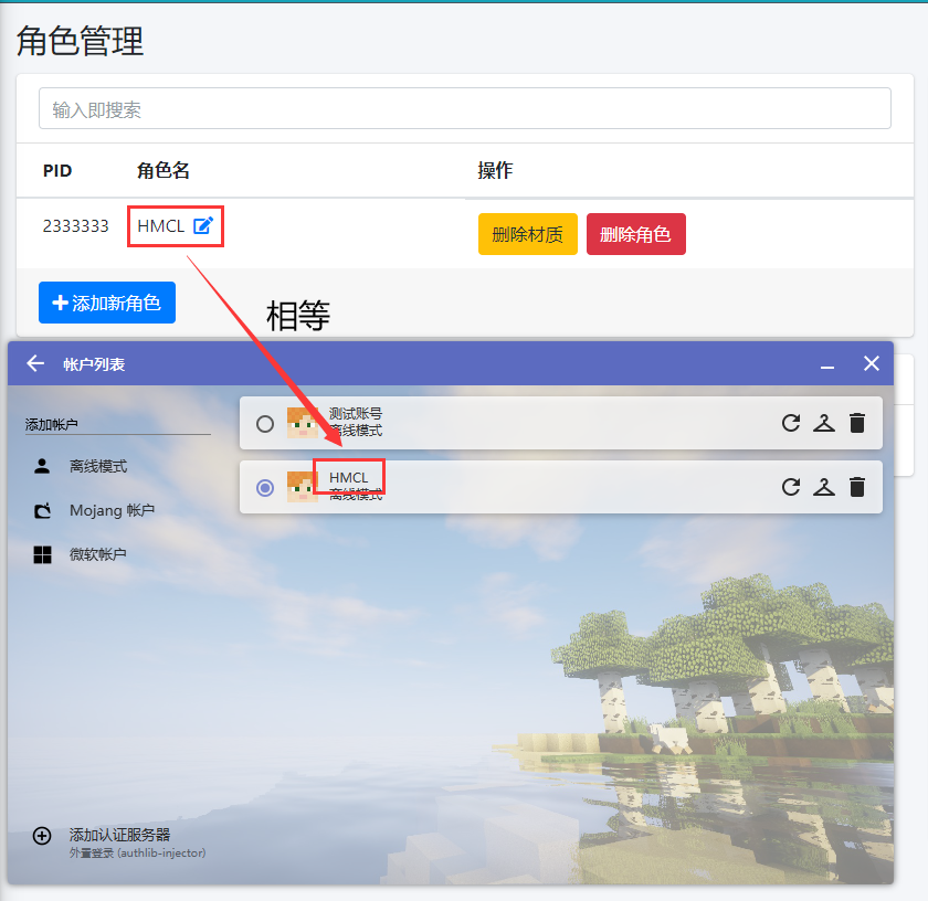 在HMCL中创建的离线账户的 账户名 必须和角色名相等, 如果不相等, 请 重新在HMCL中创建离线账户