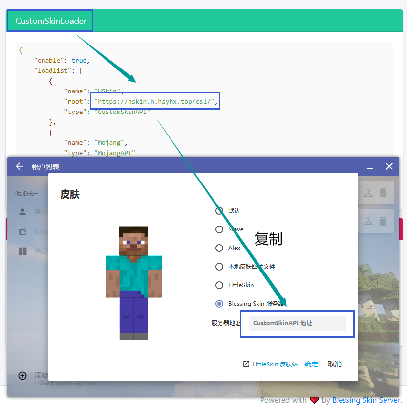 进入 配置生成, 按下图找到 CustomSkinLoader 中的网址, 复制到HMCL中即可同步在Blessing Skin 服务器上此账户名的皮肤